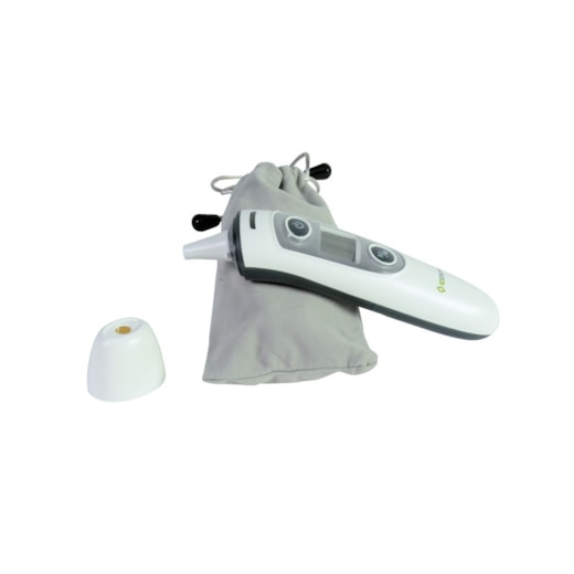 Perfil e Instruções de Utilização: Termómetro 2 em 1, sem contacto, pode seu utilizado como termómetro intra-auricular. Medição instantânea de temperatura. Capacidade para 35 memórias . Termómetro ergonómico. Instruções de utilização: O termómetro pode ser utilizado para medir a temperatura na testa para todas as idades e no modo tímpano é indicado para pessoas com mais de três meses de idade. Não utilizar o modo tímpano se o ouvido estiver infetado com supuração de otite. Efetuar a medição a uma distância de 3 cm da testa. Seguir as instruções do manual de instruções.